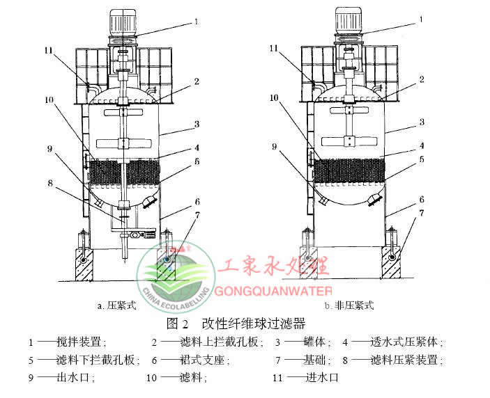 5、纖維束過濾器自耗水量低:僅為周期制水量的1~2%,可用原水配合攪拌電機經行反洗,也可用氣水反洗。